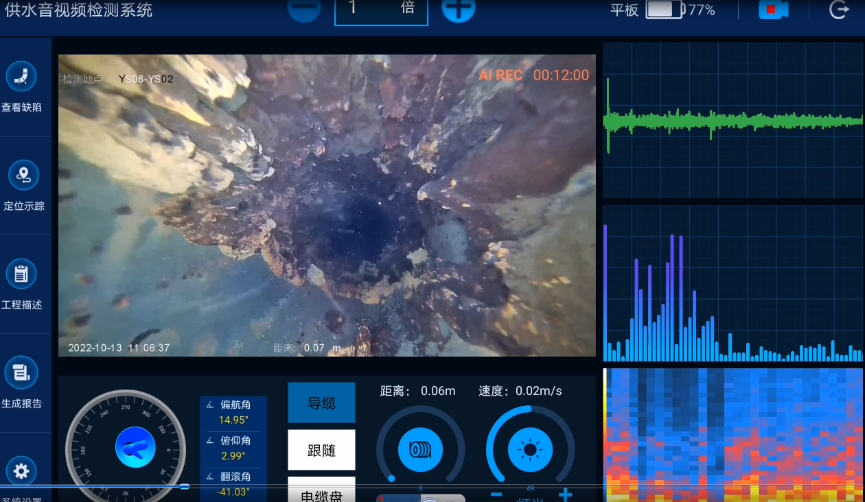智能:设备顺水流行进,实时记录分析声音、显示高清视频,智能检测漏点,一键生成专业的检测报告。设备具备一键脱伞功能,可轻松实现回收。